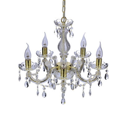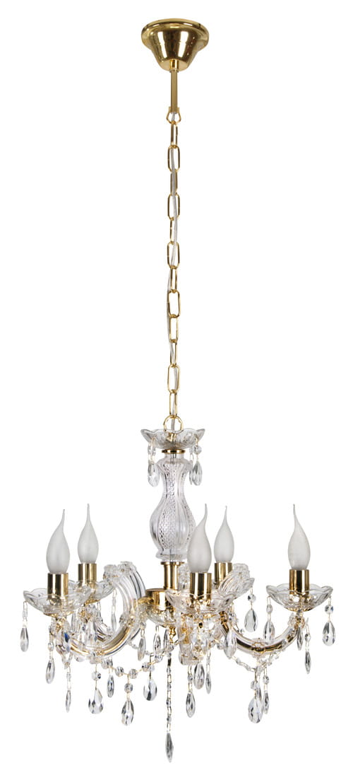 Złoty ozdobny pięcioramienny żyrandol świecznikowy Bonna. Doskonały pomysł do naszych sypialni i pokoi urządzonych w stylu klasycznym i glamour. Żyrandol o ponadczasowej formie i wyglądzie. Wszystkie piękne i mieniące się w świetle ozdoby są wykonane ze szkła. Dodatkowo złote ramiona lampy powlekają akrylowe odlewy, które nadają lampie specyficznego bogatego i szykownego charakteru. Żyrandol ma długość 115 cm - ale można go samodzielnie skrócić o poszczególne ogniwka łańcucha. Gdyby jednak nastąpiła potrzeba wydłużenia zawiesia, prosimy nas poinformować telefonicznie, lub mailowo o tej zmianie którą wykonamy bezpłatnie.
